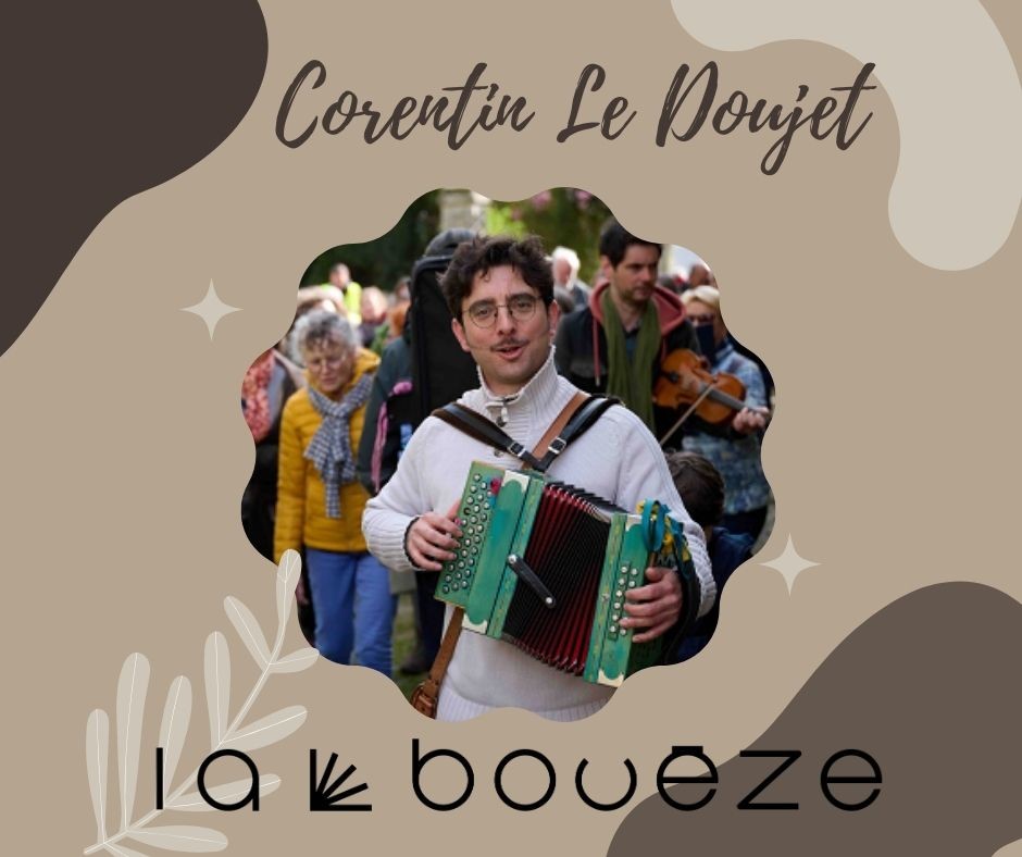 Corentin Le Doujet est un sonneur « tout terrain », membre du trio Terti-Tertan et de la fanfare La Clique Costarmorigène. S’essayant à l’accordéon diatonique, au violon, à la clarinette, au chant et au jâze dès son plus jeune âge, il enseigne la musique et le chant traditionnels de Haute-Bretagne à la Bouèze depuis 2001. Résidant à Plorec-sur-Arguenon (22), il anime de nombreux ateliers collectifs à l’année pour les enfants, les familles et les adultes dans le pays de Dinan.